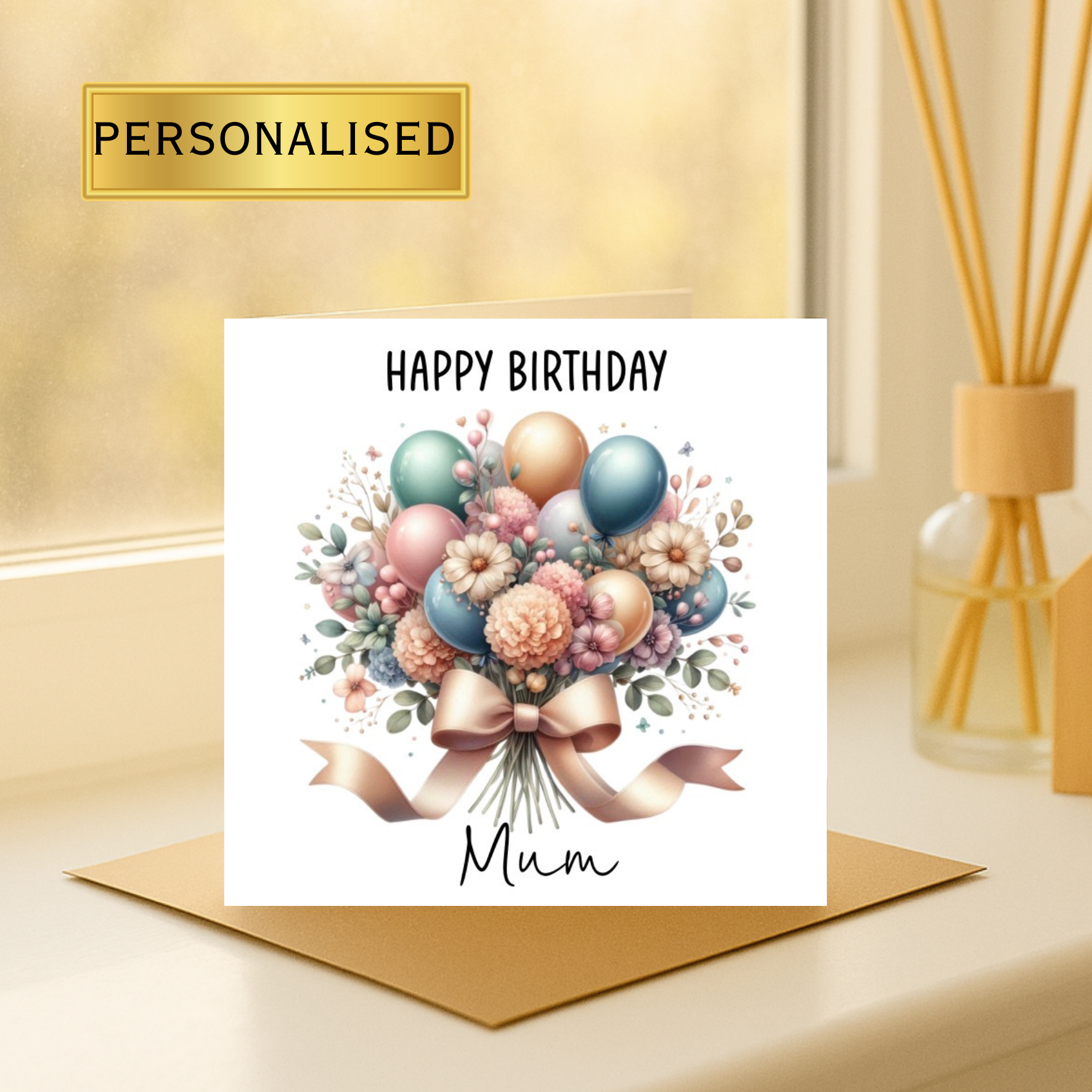 Personalised Happy Birthday Card for her – Floral & Balloon Bouquet Design – Custom Name Birthday Card – Elegant Female Birthday Card