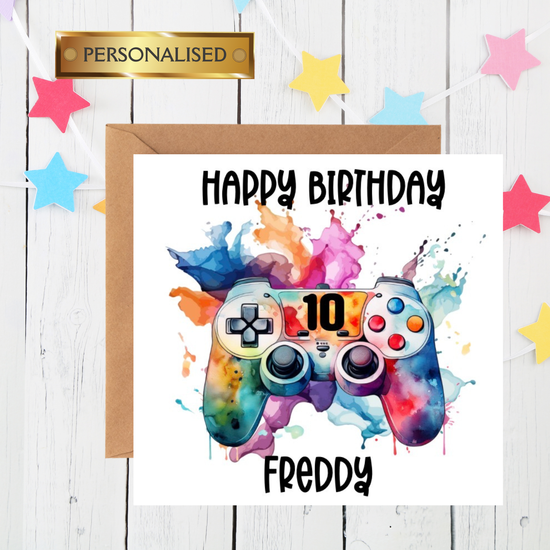 Personalised Gamer Birthday Card | Custom Age & Name | Gaming Controller Watercolour